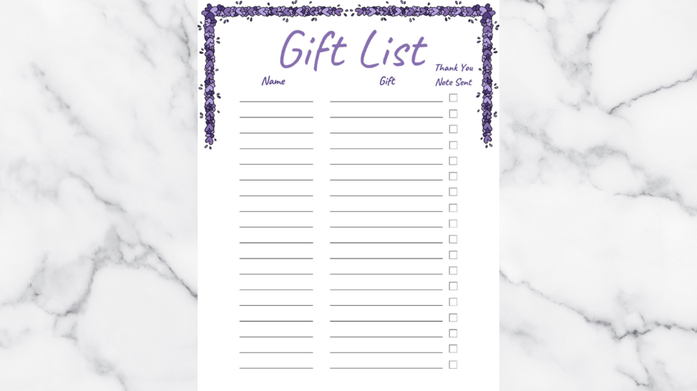 Record who gave you each gift, their name, and then mark when the thank you note has been sent for the gift.