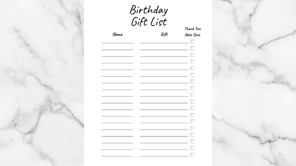 Record who gave you each gift, their name, and then mark when the thank you note has been sent for the gift.