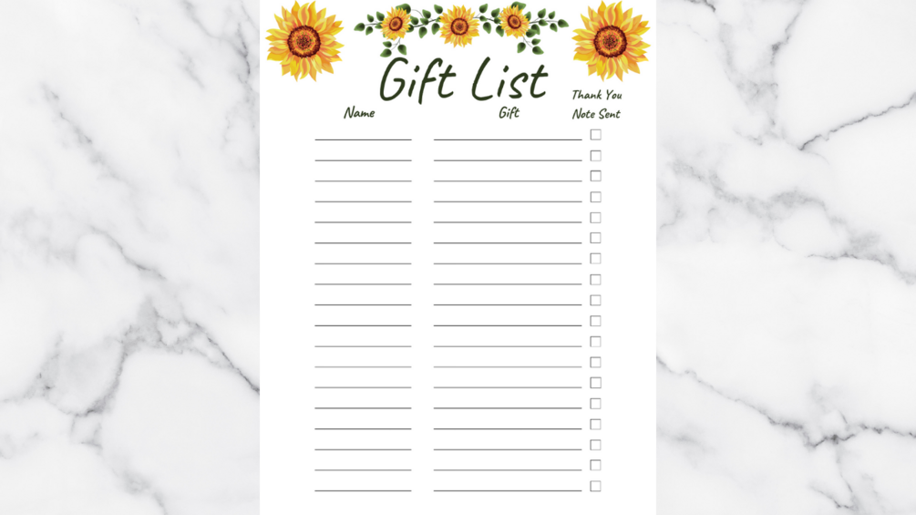 Gift List Template with sunflowers printable PDF.